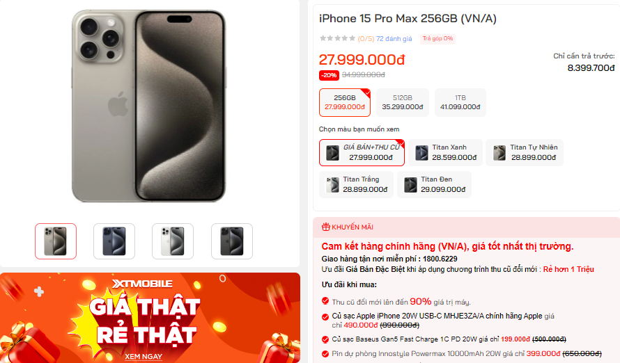 Khảo sát tại hệ thống bán lẻ XTmobile, iPhone 15 Pro Max 256GB (VN/A) đang được giảm sâu, chỉ còn 27.99 triệu đồng. Hai phiên bản bộ nhớ cao hơn là 512GB và 1TB cũng đang có giá bán vô cùng tốt, lần lượt là 35.29 triệu và 41.09 triệu đồng. So với thời điểm ra mắt, mức giá này thấp hơn gần chục triệu đồng.