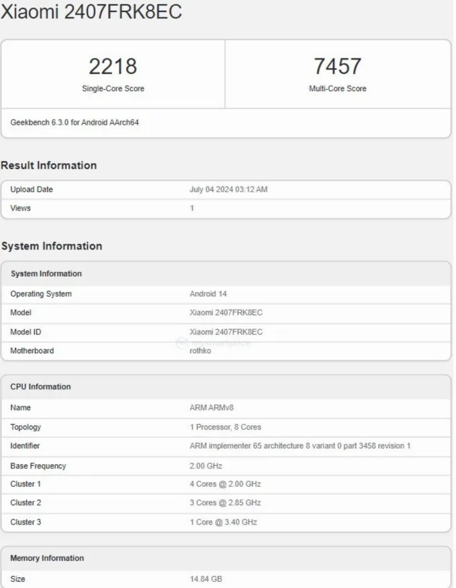 Theo tin mới nhất từ trang dữ liệu Geekbench, mẫu prototype đầu tiên của điện thoại Redmi K70 Ultra đã xuất hiện trên hệ thống với vi xử lý MediaTek Dimensity 9300+. Cụ thể, phiên bản prototype này được trang bị 16GB RAM và chạy hệ điều hành Android 14 cùng giao diện HyperOS của Xiaomi.