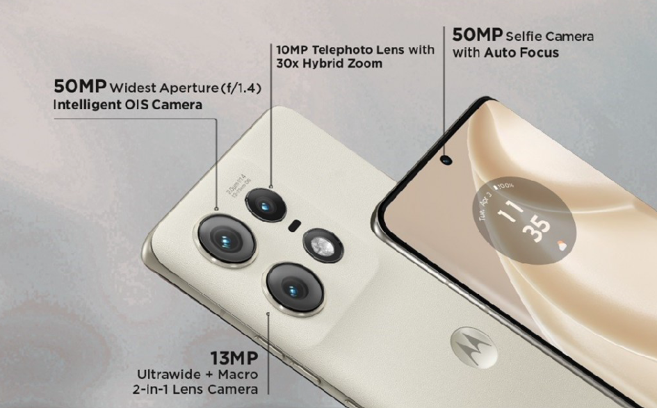 Về camera, Motorola Edge 50 Pro trang bị hệ thống 3 camera sau gồm camera chính 50MP, camera tele 10MP và camera siêu rộng 13MP. Thiết bị còn có camera selfie 50MP ẩn trong màn hình.