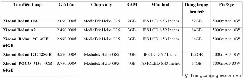 Hiện nay, điện thoại thông minh Xiaomi có rất nhiều sản phẩm đa dạng đáp ứng được nhu cầu của người dùng. Bạn có thể tham khảo bảng giá điện thoại Xiaomi mới nhất 2023 cùng các thông số kỹ thuật như: Màn hình, Pin/Sạc, RAM, bộ nhớ trong và chip xử lý,…