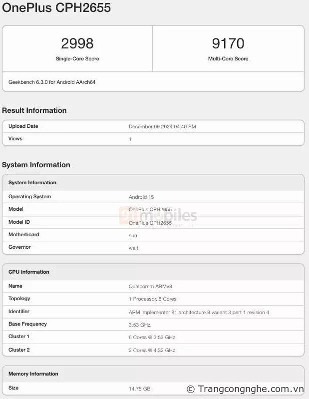 Ngoài ra, danh sách cũng cho biết OnePlus 13 sẽ có 14,75GB (16GB) RAM và chạy hệ điều hành Android 15, rất có thể sẽ được tùy biến bằng giao diện OxygenOS 15 trên nền tảng này. Phần mã nguồn của máy cũng nhắc đến "sun", có thể ám chỉ vi xử lý Qualcomm Snapdragon 8 Elite với 6 lõi chạy ở tần số 3,53GHz và 2 lõi ở 4,32GHz.