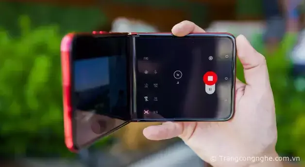 Razr Plus có thể biến thành một máy quay phim nhỏ gọn khi gập một nửa và cầm ngang, ví dụ như trên. Màn hình bên ngoài cũng có thể được sử dụng để hiển thị trước ảnh bạn đang chụp khi bạn nhấn nút chụp, cho phép người được chụp thấy hình ảnh của họ trong khi bạn chụp.