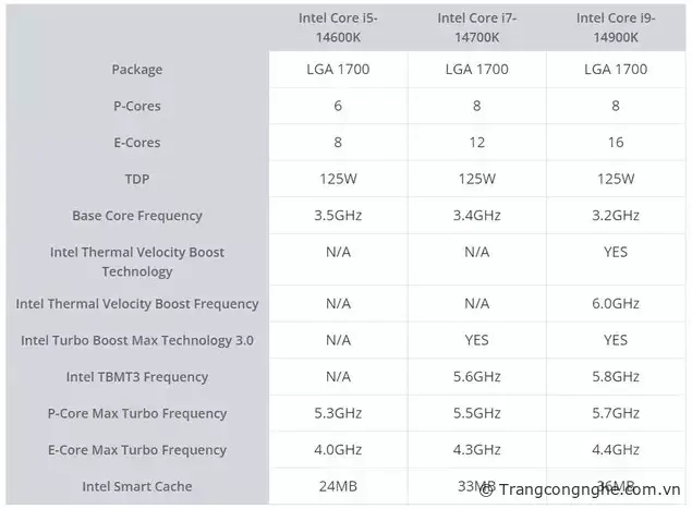 Dưới đây là bảng chi tiết về thông số kỹ thuật của ba model CPU mới của Intel: Core i9-14900K, i7-14700K và i5-14600K.