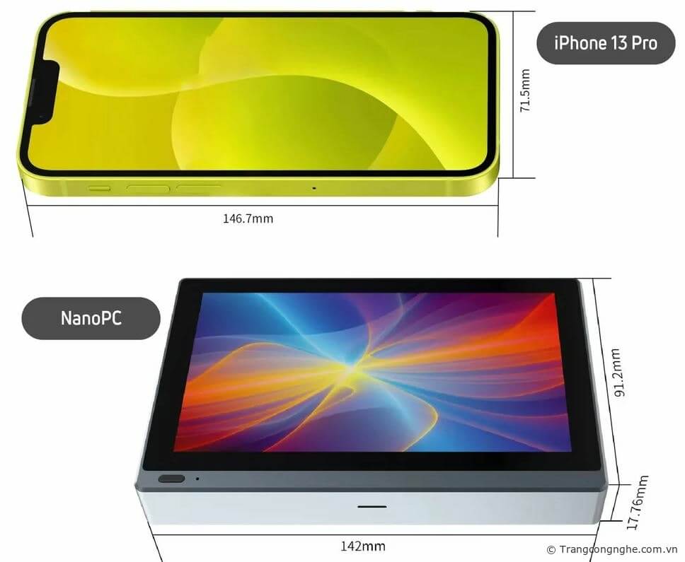 So sánh kích thước NanoPC và một chiếc iPhone 13 Pro.
