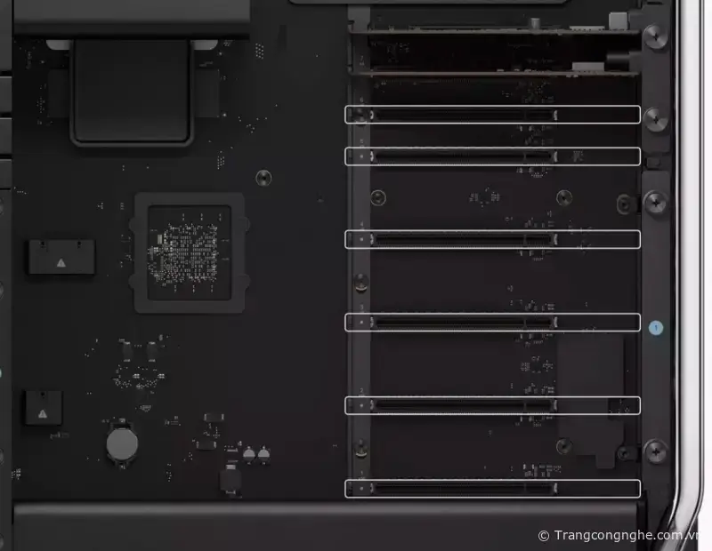 Mac Pro 2023 không thể thêm card đồ họa rời bên ngoài mặc dù có 6 khe PCIe Express. Chip M2 Ultra được chuyên gia giải thích là chiếc máy Mac Pro 2023 đã quá đủ sức xử lý đồ họa nặng nhất tại thời điểm hiện tại.