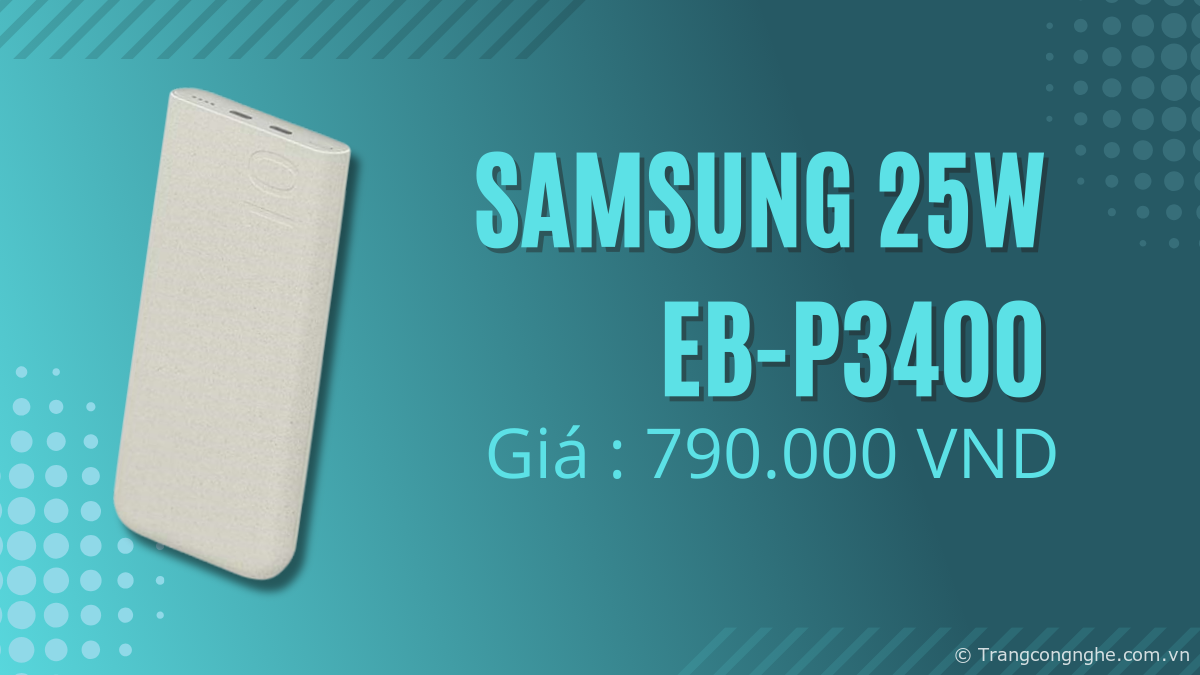 Sản phẩm đầu tiên trong danh sách tới từ thương hiệu Samsung - EB-P3400 10.000 mAh, có công suất sạc nhanh lên đến 25W. Sạc dự phòng đa năng EB-P3400 làm từ vật liệu tái chế được chứng nhận bởi UL. Nhà sản xuất sử dụng vật liệu tái chế không chỉ giúp giảm lượng khí thải carbon mà còn đóng góp vào việc bảo tồn tài nguyên quý giá của hành tinh.