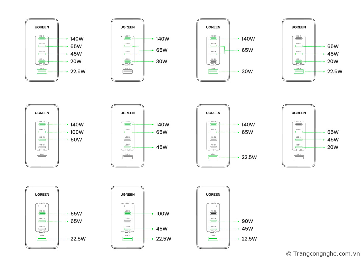 Theo công bố của UGREEN, người dùng có thể sạc cùng lúc ba máy tính xách tay thông qua cổng USB-C, trong đó cổng USB-C1 cung cấp 140W, cổng USB-C2 có công suất 100W và cổng USB-C3 cho phép sạc ở công suất 60W. Cổng USB-C thứ 4 sạc được 45W và cổng USB-A còn lại sạc được với công suất 22.5W.