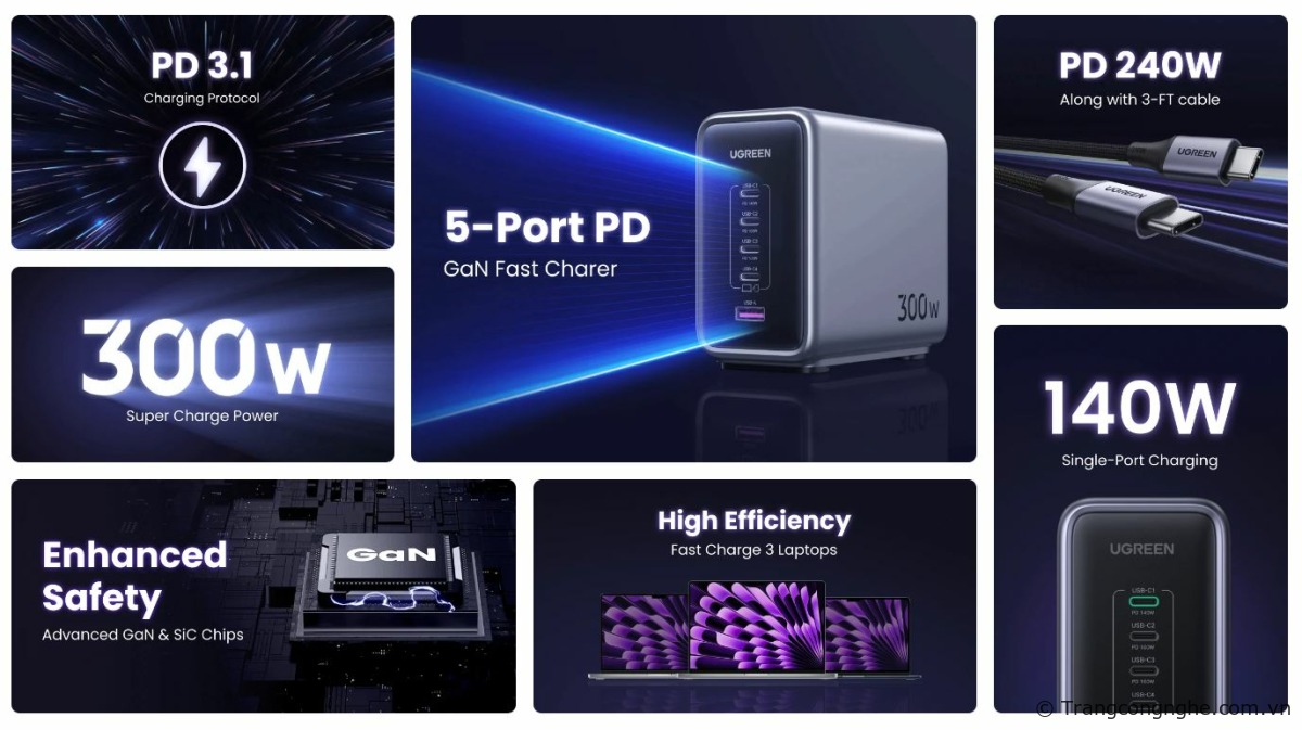 Với việc hỗ trợ tất cả các giao thức sạc nhanh phổ biến, bao gồm PD/QC/SCP/FCA/AFC, và công suất nằm trong nhóm mạnh nhất trong thế giới sạc hiện nay thì UGREEN Nexode 300W có thể sạc gần như mọi thiết bị công nghệ, từ MacBook, iPad, laptop Windows, Chromebook, máy bay khôn người lái, máy chơi game cầm tay, điện thoại, tai nghe, smartwatch, …. Hãng cho biết, MacBook Pro 16 inch có thể sạc lên 56% chỉ trong 30 phút.