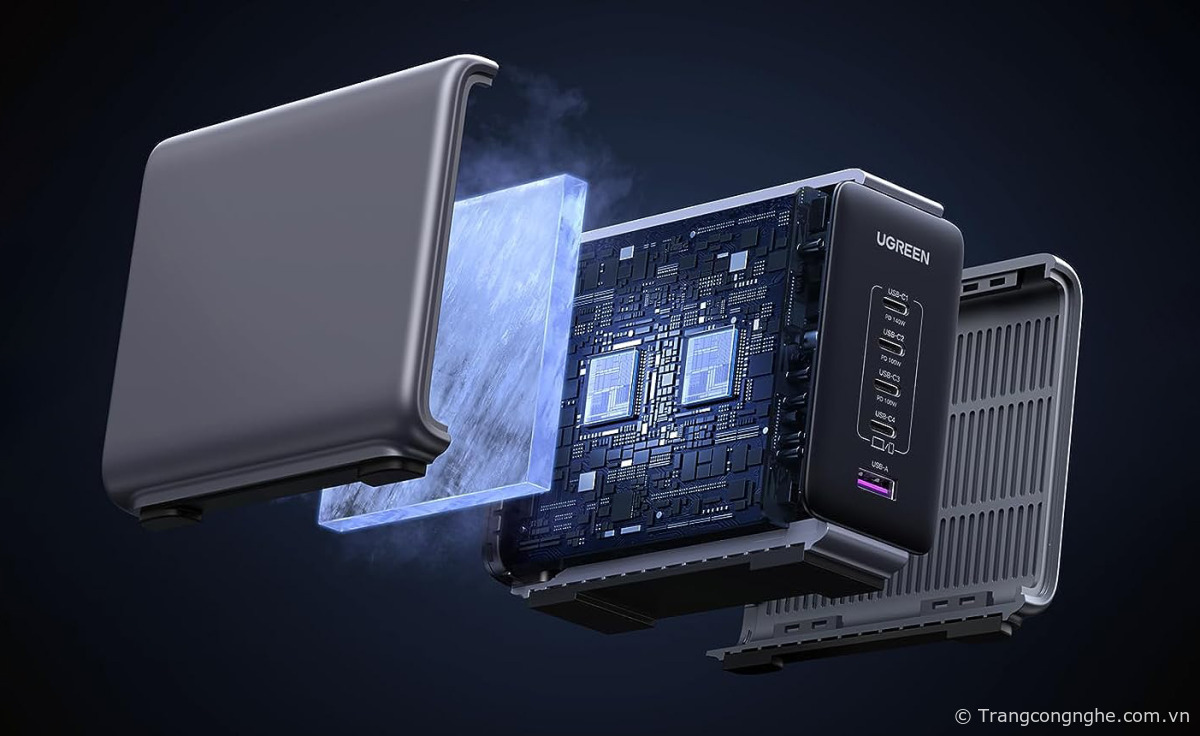 Ở mặt trước, UGREEN Nexode có 4 cổng USB loại C và một cổng USB loại A có thể sạc tối đa 5 thiết bị, có công suất tối đa 300W. Mặt sau là nơi cắm dây nguồn 3 chấu và thông số kỹ thuật của củ sạc.