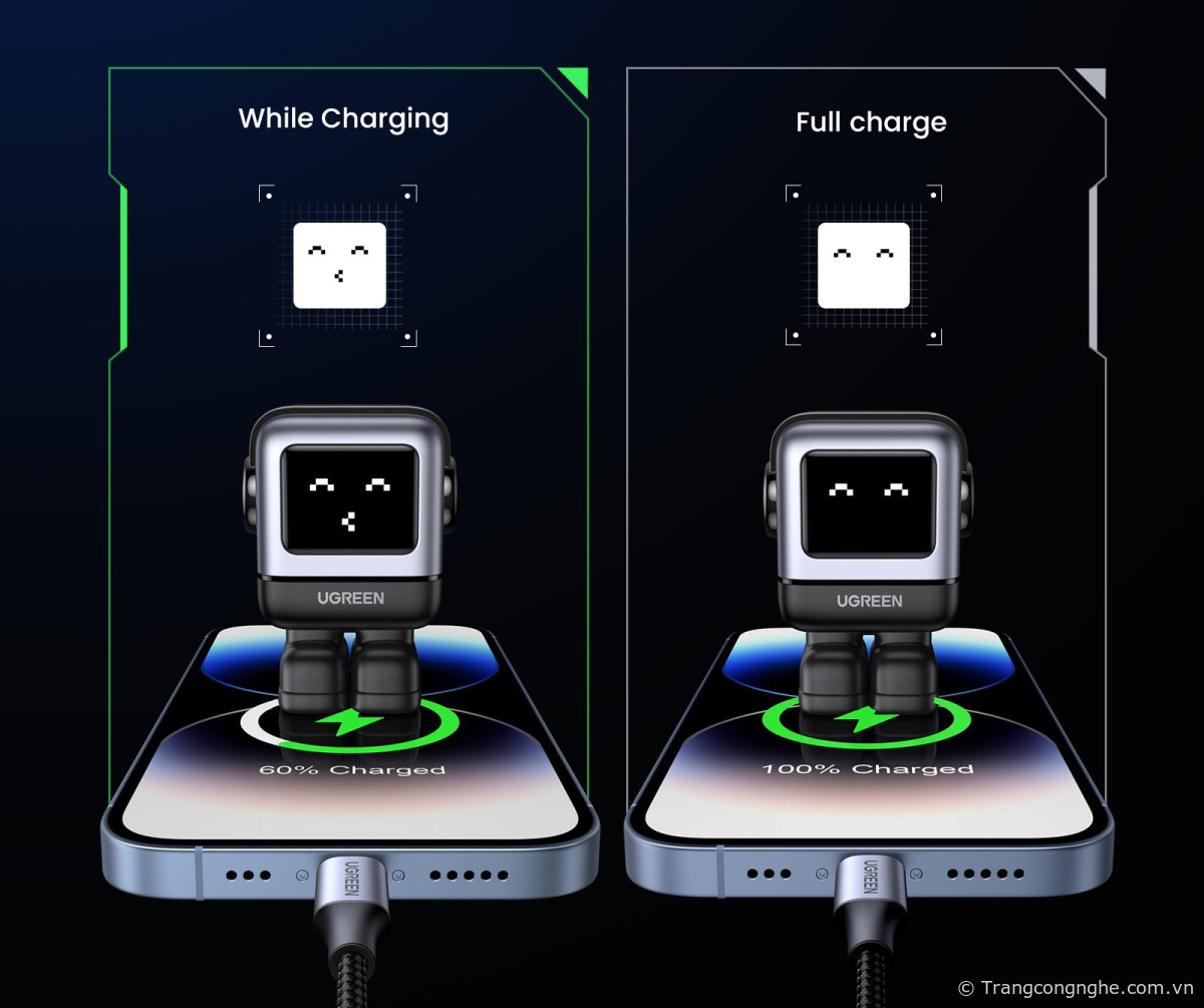 Ở mặt phía trước của sạc có một màn hình LED nhỏ hiển thị tạo hình khuôn mặt cảm xúc khá ngộ nghĩnh. Tính năng hiển thị tình trạng sạc ngay trên củ sạc thông qua biểu tượng cảm xúc khá thuận tiện cho người dùng biết thiết bị đã được sạc đầy hay chưa mà không cần chạm vào điện thoại.