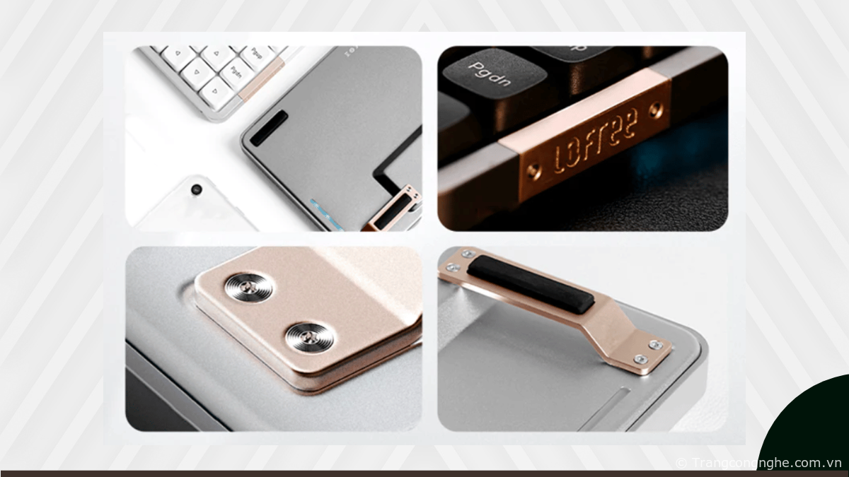 Để tạo điểm nhấn, Lofree đã sử dụng một miếng kim loại khác màu có khắc chìm chữ Lofree đặt ở bên cạnh phải. Phần khung vỏ bàn phím được cố định bằng các ốc lục giác, mang lại cảm giác chắc chắn cũng như giúp tháo lắp dễ dàng hơn.