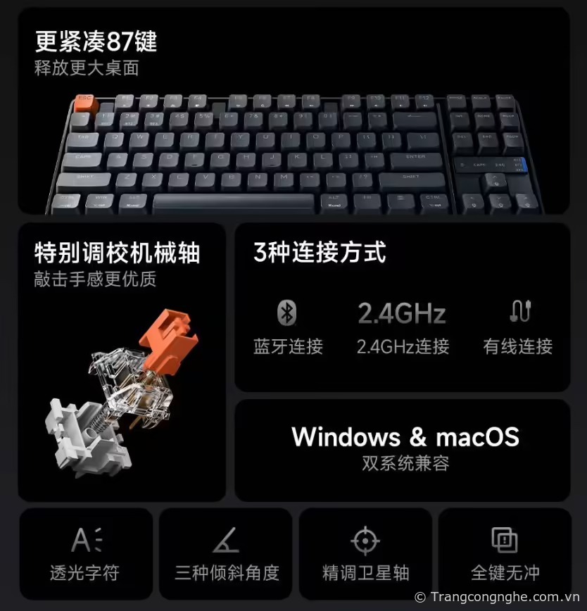 Với khả năng tương thích các hệ điều hành Windows và macOS, đồng thời hỗ trợ Bluetooth, kết nối không dây 2.4GHz và có dây, Bàn phím cơ Xiaomi TKL dễ dàng thích ứng và kết nối với nhiều chế độ khác nhau. Pin 2000mAh đảm bảo thời gian sử dụng liên tục trong thời gian dài.