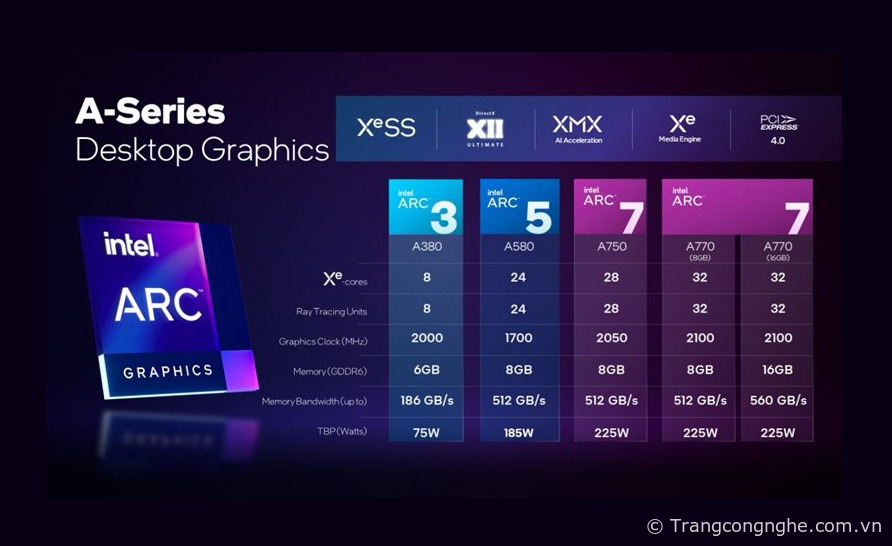 Intel Arc A580 mới dựa trên GPU ACM-G10 cao cấp của Intel, nhưng nó bị cắt giảm một số tính năng để có được mức giá thấp và người dùng dễ tiếp cận hơn. Intel Arc A580 trang bị 24 nhân Xe và hỗ trợ Ray tracing, với mức xung nhịp gốc 1.700 MHz, so với các dòng card đồ họa gần đây đều sở hữu khả năng ép xung nhịp lên đến 2.000 MHz.
