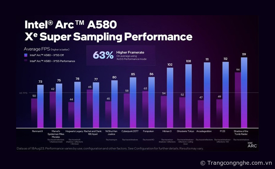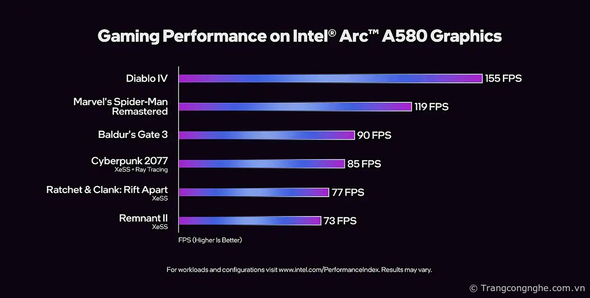 Trang sản phẩm Intel Arc A580 cho biết card đồ họa này cung cấp tốc độ khung hình cao cho các tựa game phổ biến ở độ phân giải 1080p. Trên Diablo IV và Marvel's Spider-Man Remastered, nó cung cấp tốc độ tương ứng là 155 fps và 119 fps. Baldur's Gate III và Cyberpunk 2077 (Với XeSS và dò tia) chạy ở tốc độ 90 fps và 85 fps.