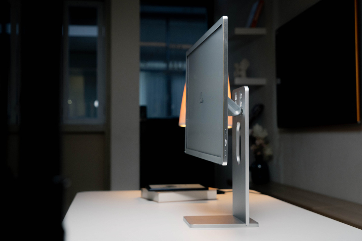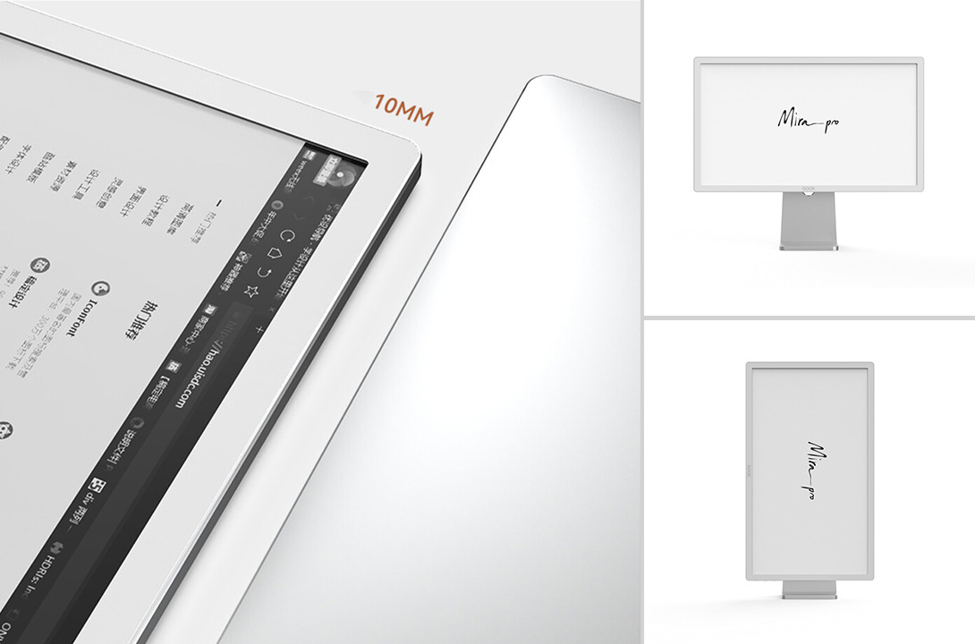 Vỏ của Mira Pro E-Ink được làm từ hợp kim nhôm có kích thước 25,3 inch, cạnh viền dày khoảng 10mm và có tỷ lệ màn hình so với thân máy là 85%. Chân đế của máy cũng được hoàn thiện bằng hợp kim nhôm chắc chắn và cao cấp, hỗ trợ các góc lật nghiên lên xuống 40 độ và xoay màn hình 90 độ.
