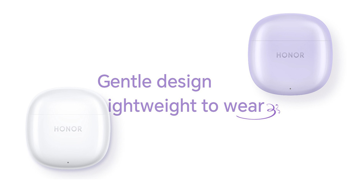 honor Earbuds X6 có hai màu tím và trắng với case sạc hình trong nhỏ gọn như một viên đá cuội. Tai nghe được thiết kế dạng đeo nửa tai và mỗi bên chỉ nặng 3,8g giúp người đeo thoải mái khi sử dụng trong thời gian dài.