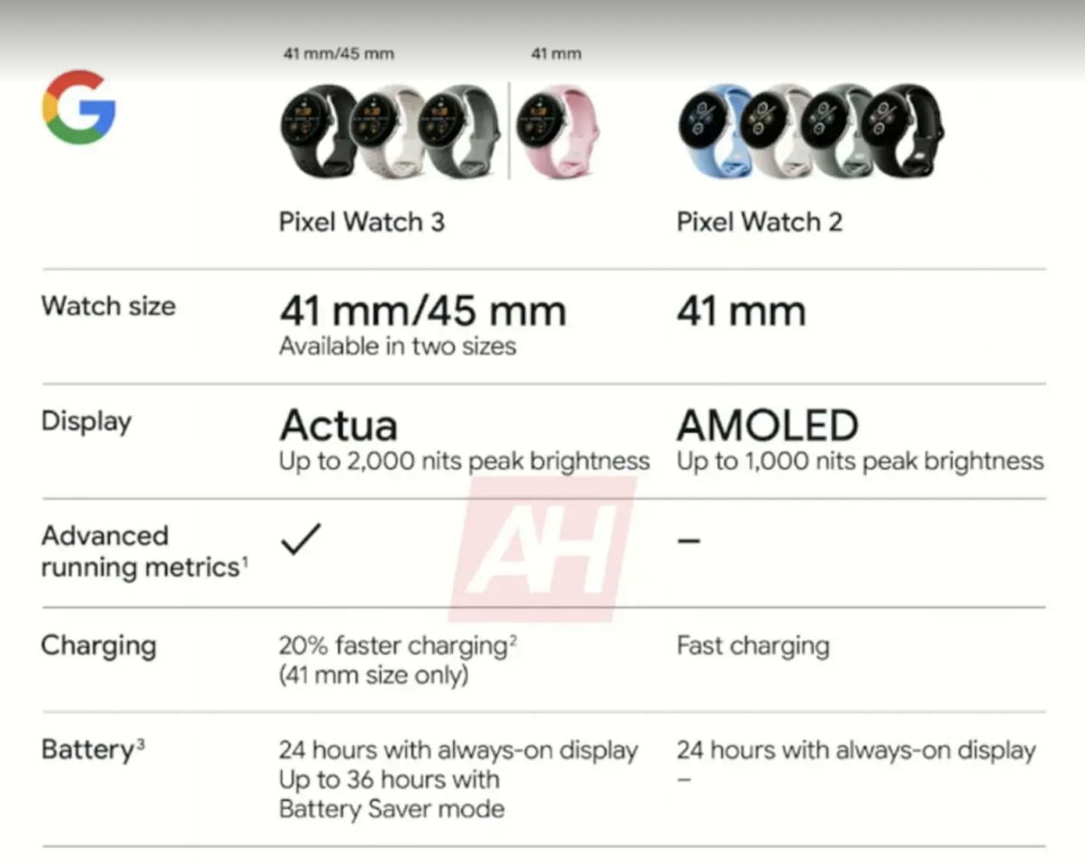 Pixel Watch 3 sẽ có 2 kích thước màn hình là 41mm và 45mm, đều sử dụng công nghệ màn hình Active Display của Google, cho khả năng hiển thị nội dung rõ ràng ngay cả khi đồng hồ không được kích hoạt. Màn hình đồng hồ hỗ trợ độ sáng lên đến 2.000 nits, giúp người dùng có thể xem rõ nội dung ngay cả trong điều kiện ánh sáng mặt trời. Đặc biệt, phiên bản 41mm hứa hẹn sạc nhanh hơn 20% so với thế hệ trước.