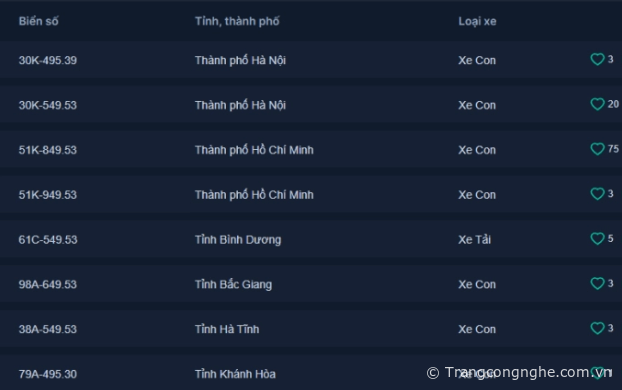 Danh sách đấu giá biển số xe ô tô bao gồm các biển số từ tất cả 63 tỉnh, thành phố, trong đó bao gồm cả các biển số kết thúc bằng 49 và 53.