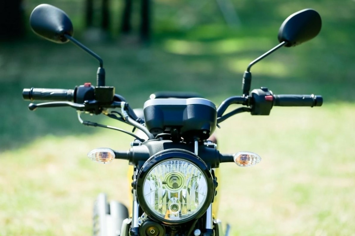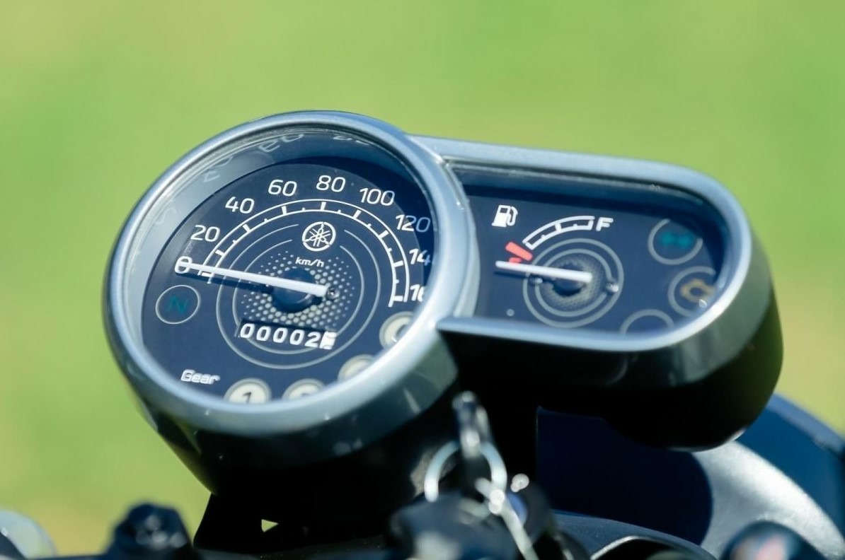 Ở phía đầu xe, cụm đèn pha trong halogen cổ điển, dè chắn bùn trước và tay lái đặt cao phong cách motor cào cào. Đồng hồ số dạng analog đơn giản, hiển thị tốc độ, mức số và đồng hồ nhỏ báo mức xăng.