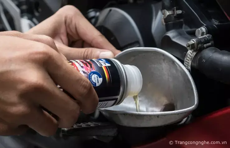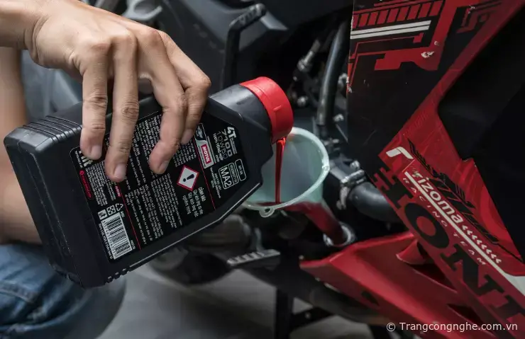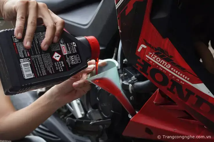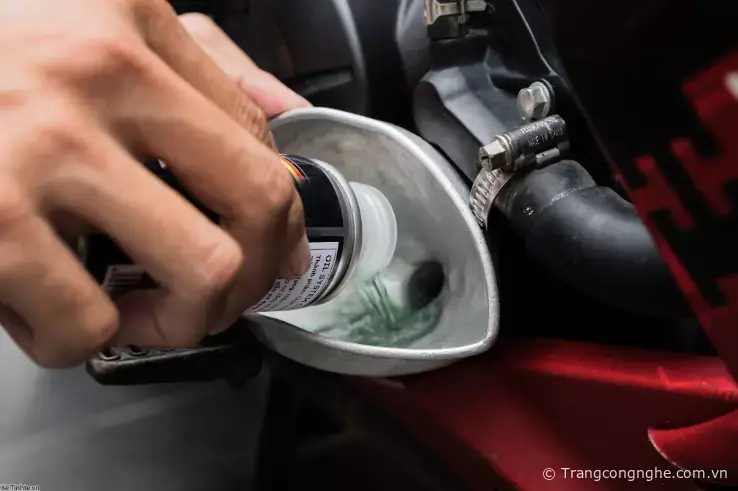 Anh em dùng phễu để châm nhớt mới vào động cơ, nên chú ý ước lượng để không bị dư nếu dung tích bình nhớt mua sẵn nhiều hơn khuyến cáo của hãng xe. Chẳng hạn như các loại xe số phổ thông thường chỉ cần thay 0,8 lít, nếu anh em có bình nhớt 1 lít hãy chú ý để không châm thừa, không phải cái gì nhiều cũng tốt.