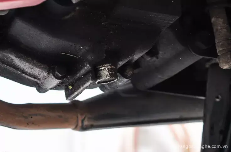 Sau khi xe chạy cầm chừng đủ thời gian, mình tiến hành đến công đoạn xả nhớt. Khi đã xác định được vị trí ốc xả nhớt, anh em đưa chìa khóa hoặc tuýp vào để mở. Để dễ nhớ, nếu anh em đang ở bên trái xe thì đẩy chìa khóa về trước để nới lỏng ốc, và làm ngược lại cho phía đối diện.
