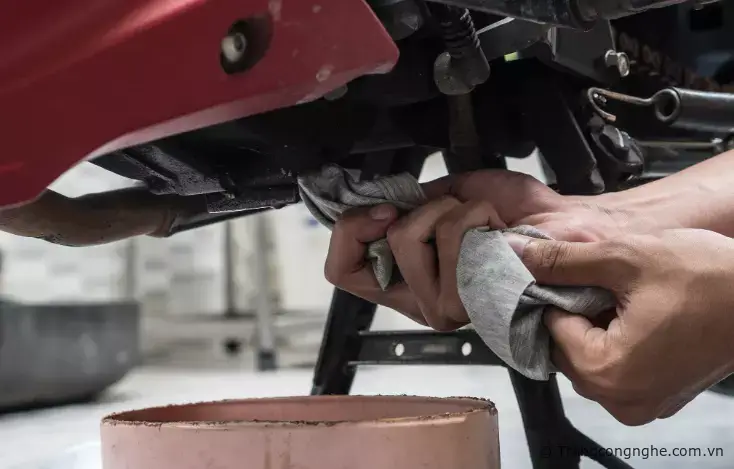 Sau khi đã hết nhớt cũ, anh em nên rửa sạch cát bụi bám trên ốc bằng dầu hôi rồi lau khô, dùng khăn sạch lau đất bên trong chân răng rồi hãy vặn ốc trở lại. Tuy hơi rườm rà nhưng ít nhiều hạn chế được chất bẩn lọt vào động cơ, cũng như làm hư hỏng chân răng khi vặn ốc vào.