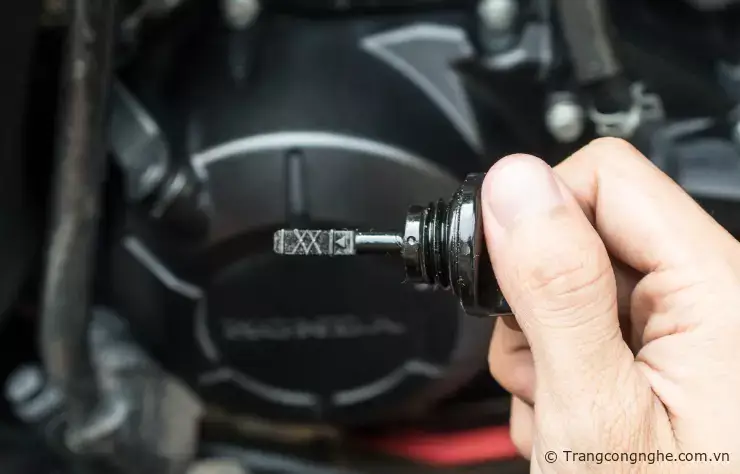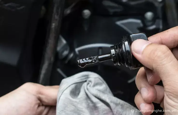 Tiếp đến dùng que thăm để kiểm tra xem đã đủ lượng nhớt cần thiết hay chưa. Trên que thăm có hai đường ngang để chỉ mức nhớt, dưới là mức tối thiểu và trên là mức tối đa. Cách sử dụng đúng là lau khô que thăm bằng khăn sạch, sau đó cắm vào lỗ, không vặn và lấy ra để xem mức nhớt đang ở đâu.