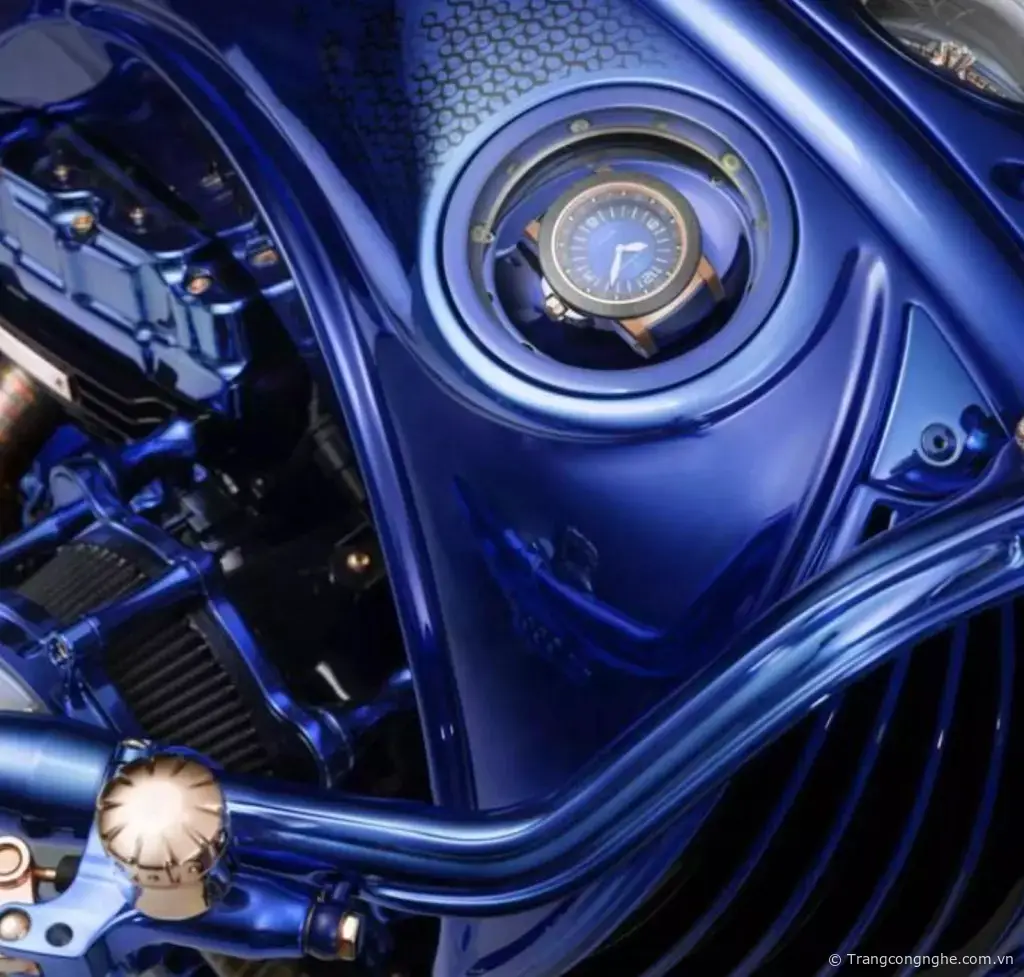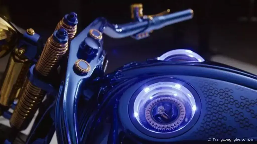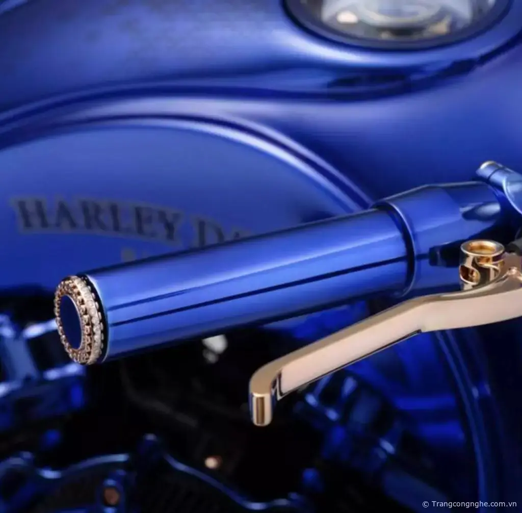 Harley-Davidson Blue Edition còn sở hữu 360 viên kim cương khác, tổng cộng 32.962 carat, ở nhiều vị trí khác nhau. Chỉ cần nhìn thoáng qua, không khó để nhận ra các bộ phận như vỏ đèn pha, giảm xóc, chỗ để chân, ốc vít… đều được nạm vàng nổi bật.