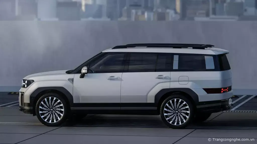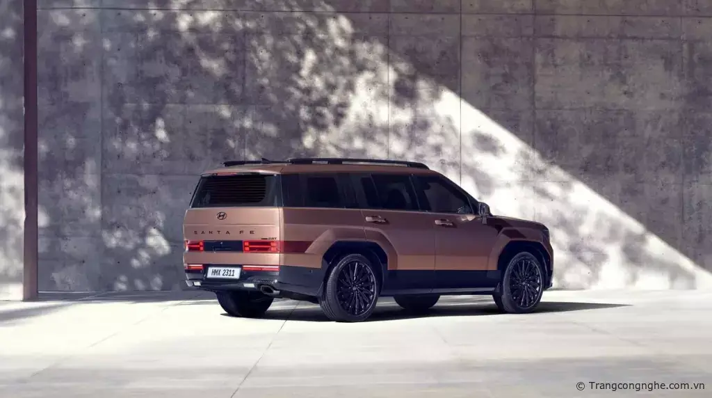 Khi nhìn từ phía bên hông, Hyundai Santa Fe 2024 có hốc bánh mở rộng với thiết kế vuông vức, tạo ra một diện mạo mạnh mẽ và thể thao hơn. Xe có các bề mặt phẳng và nóc xe dốc dần về phía sau, kết hợp với chiếc baga màu đen tạo nên một vẻ ngoài khỏe khoắn. Đường chân kính của xe không còn nhấn lên gần cột C như trước đây, mà kéo thẳng về phía đuôi xe. Mỗi phiên bản của Hyundai Santa Fe 2024 sẽ được trang bị một loại vành lazang riêng biệt, mang đến sự đa dạng và lựa chọn cho khách hàng.
