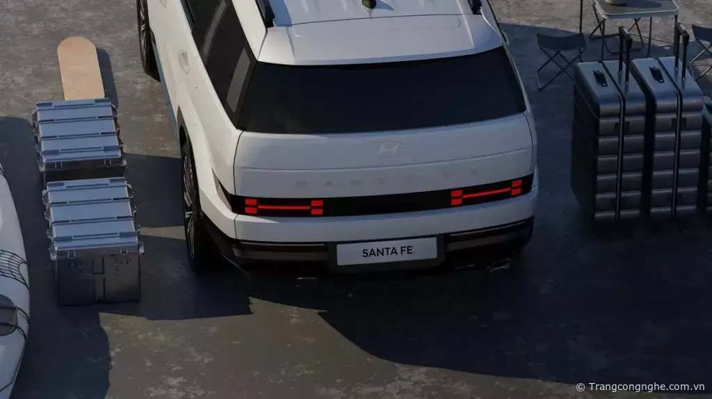Ở phần sau, Hyundai Santa Fe 2024 được trang bị đèn hậu thiết kế hình chữ "H" độc đáo. Dải đèn này được đặt thấp, gần khu vực nắp cốp, tạo nên một vẻ estetik độc đáo và hiện đại. Xe cũng có gạt mưa được giấu sau cánh gió, tăng tính thẩm mỹ và tạo sự gọn gàng cho gương sau của xe.