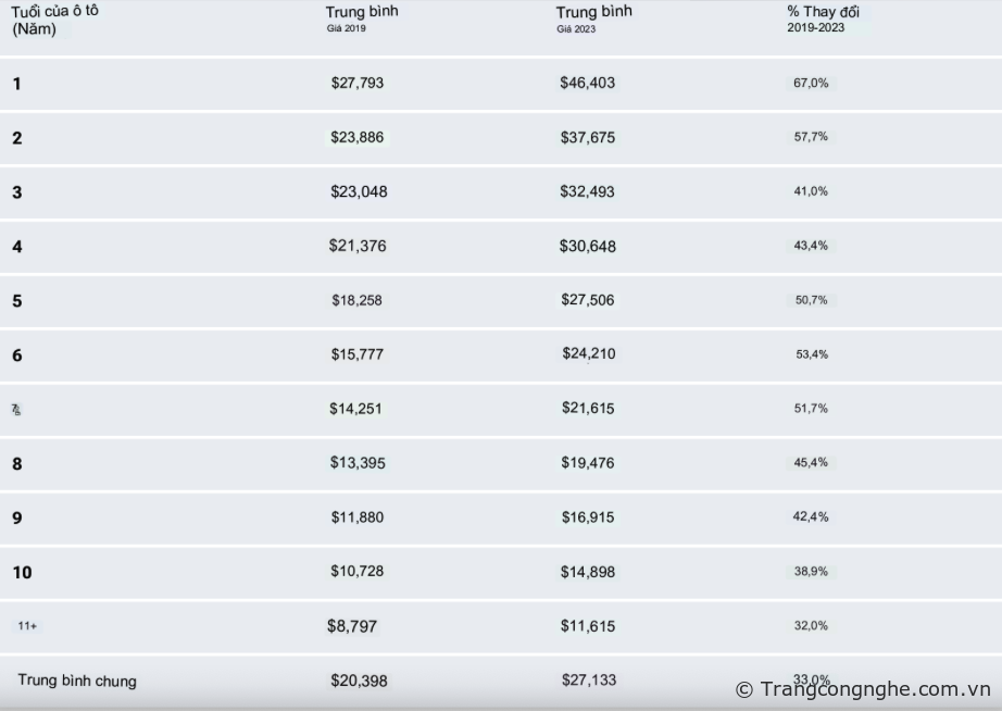 Cụ thể, giá xe cũ 1 năm tuổi tăng từ 27.793 USD (2019) lên 46.403 USD, tức tăng 67%. Xe cũ 3 năm tuổi tăng từ 23.048 USD lên 32.493 USD. Thậm chí xe cũ đã 10 năm tuổi cũng tăng giá 38,9%, từ 10.728 USD lên 14.898 USD.