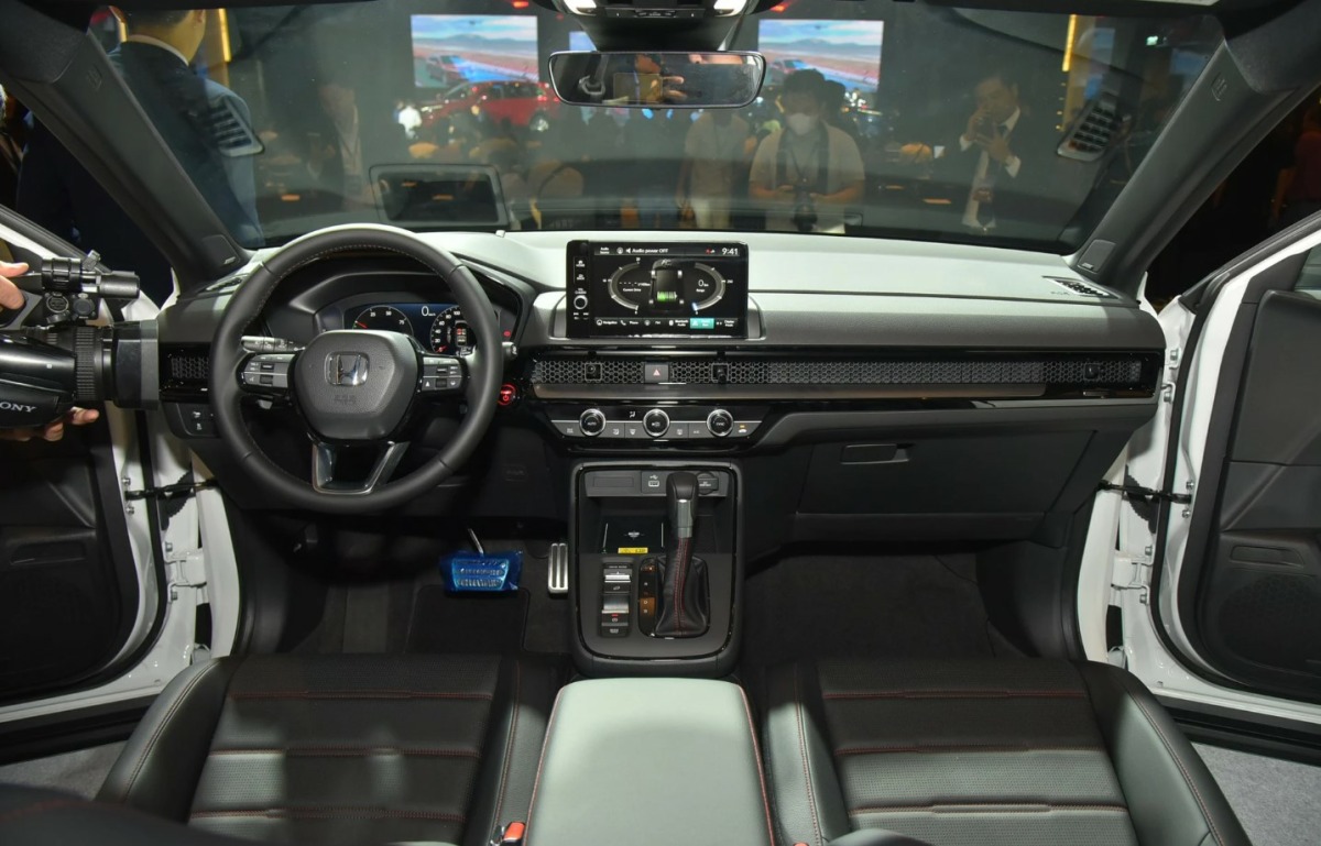 Honda CR-V 2024 thể hiện rõ sự kế thừa triết lý thiết kế khoang nội thất Civic gen 11 với bảng táp lô phân tầng và màn hình trung tâm đặt nổi. Vô lăng cũng có thiết kế tương tự Civic với cấu trúc 3 chấu thanh mảnh. Trong khi đồng hồ lái được nâng cấp kỹ thuật số với màn hình TFT 12 inch.