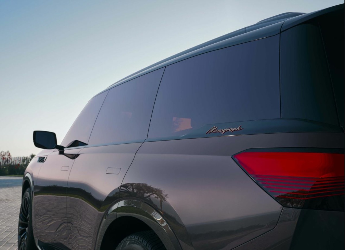 Tay nắm cửa có thể ẩn vào trong thân xe đồng thời logo AWD trên cửa sau và dòng chữ Autograph gắn trên viền cửa sổ sau, thường được dành riêng cho các phiên bản cao cấp nhất của mẫu Infiniti.