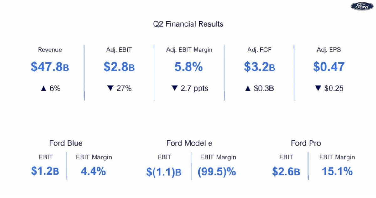 Doanh thu chung của Ford vượt dự báo, đạt 47,81 tỷ USD, tăng 6% so với doanh thu từ xe ô tô. Tuy nhiên, lợi nhuận trên mỗi cổ phiếu lại thấp hơn dự kiến đáng kể, đạt 0,47 USD so với dự báo 0,64 USD. Nguyên nhân chủ yếu được quy cho những thua lỗ khổng lồ tới 1,1 tỷ USD trong kỳ của bộ phận xe điện Model E, nâng tổng lỗ của xe điện lên gần 2,5 tỷ USD trong nửa đầu năm 2024.