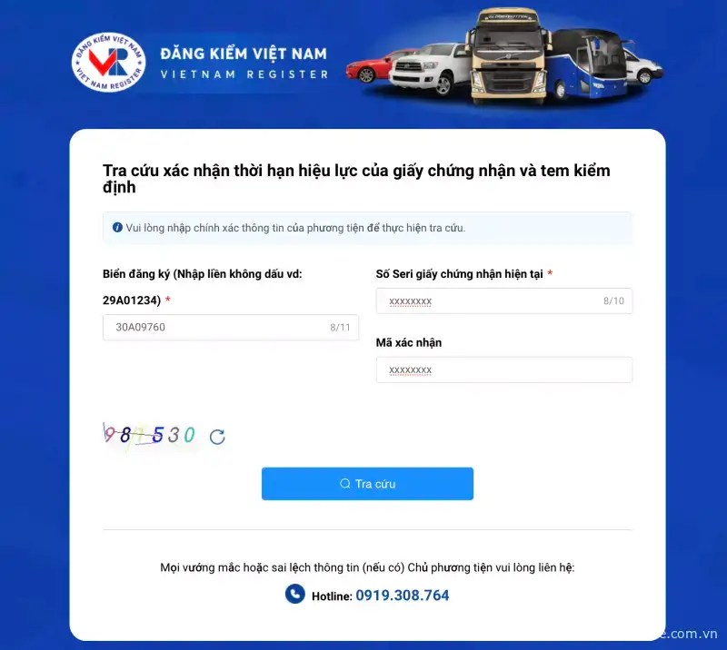 Phần lớn lỗi xảy ra là do người dùng nhập Biển số xe và Số Seri giấy chứng nhận không chính xác vì vậy hệ thống đều thông báo và trả kết quả "Không có dữ liệu". Bạn cần kiểm tra kỹ lại và điền đẩy đủ thông tin. Trường hợp thông tin đã chính xác nhưng hệ thống vẫn thông báo không tìm thấy, bạn có thể liên hệ ngay đường dây nóng để giải đáp thắc mắc : 0919.308.764